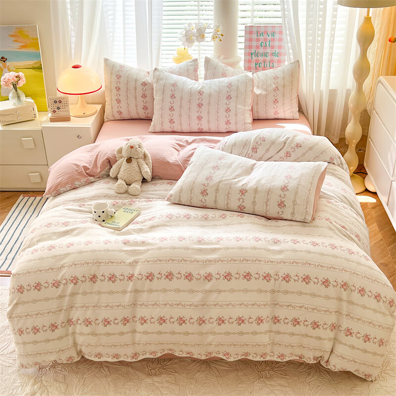 南极人水洗棉床上四件套家用双层纱床单被套床笠宿舍单人三件套床上用品 寻梦-粉(白薇)【亲肤裸睡】 2.0m 床单款 四件套-被套200*230cm